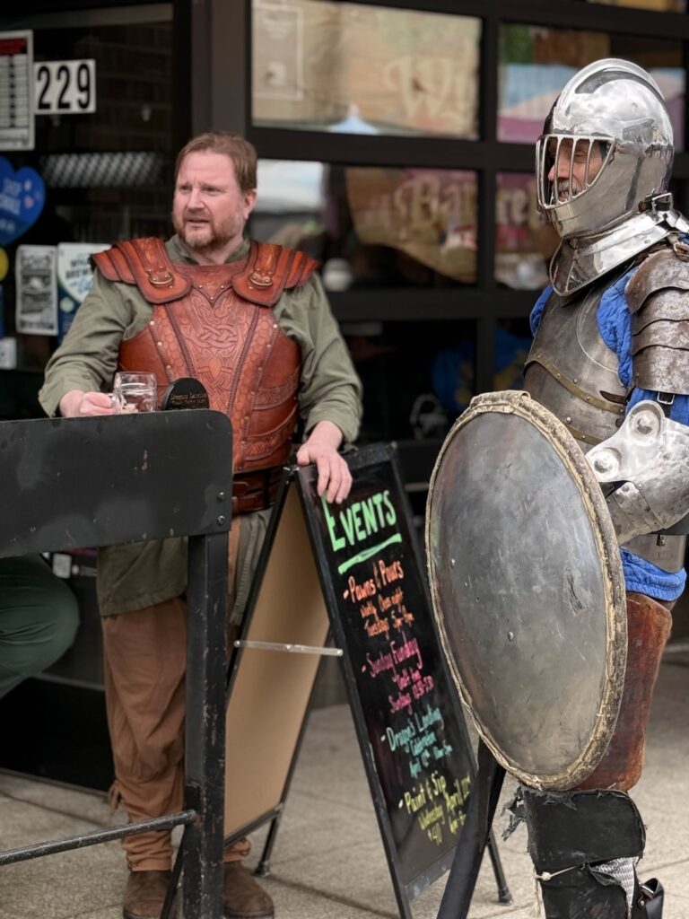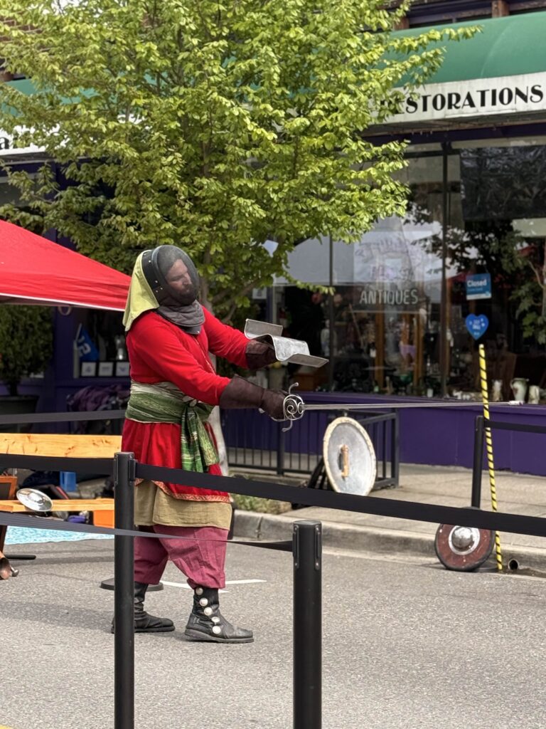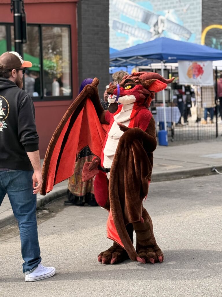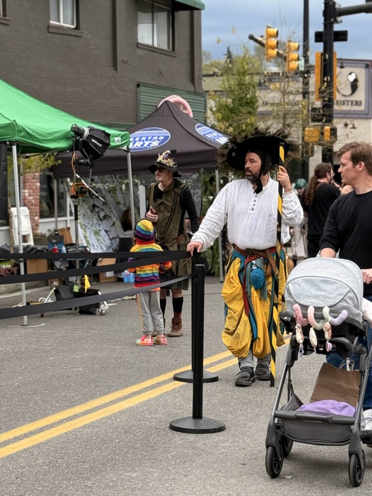 For the seventh year, the Renton Municipal Arts Commission brought Dragon’s Landing to Wells Avenue between South 2nd and South 3rd Streets, and the block answered in full costume and around 1400 visitors. From 10 a.m. to 5 p.m., leather armor, chain mail, wizard robes, and more than a few elven ears filled the street. Knights and nobles mingled with fantastical creatures, and the air at times carried the faint smell of fire.